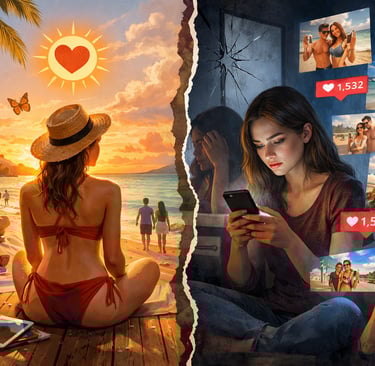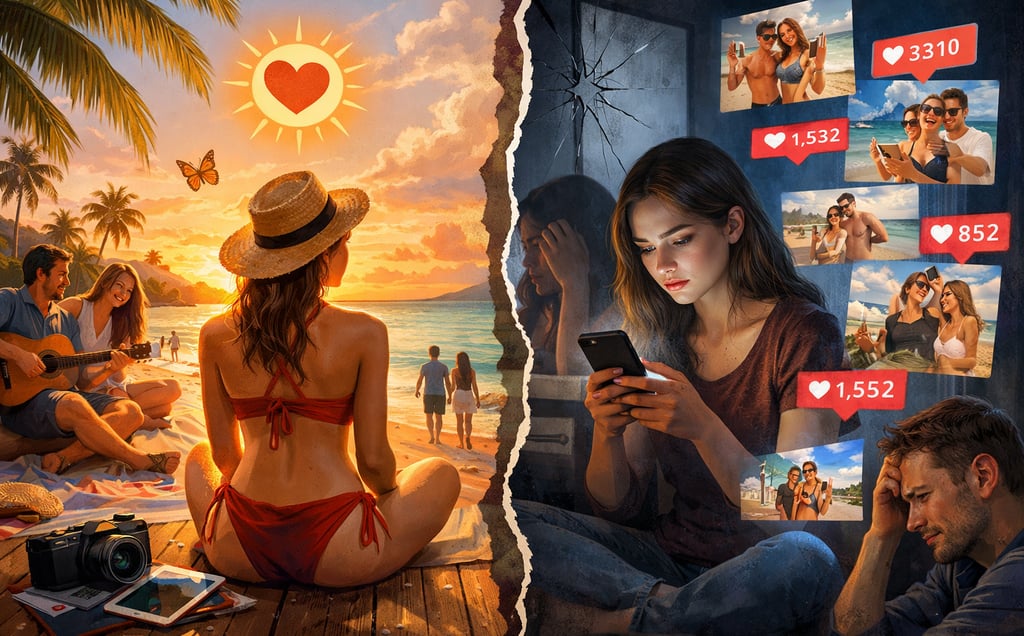Neste período do ano, intensificam-se as viagens, as visitas a familiares, as idas à praia e a outros destinos que favorecem a produção de inúmeras fotografias. Não é incomum que indivíduos exibam suas formas corporais, cultivadas ao longo dos meses anteriores, para compor postagens nas redes sociais acompanhadas de frases de efeito e filtros que realçam o resultado obtido. Publicar imagens, por si só, não constitui um problema. A dificuldade emerge quando tais postagens transformam-se em um dispositivo de validação: nesse caso, o sujeito não está propriamente vivendo sua experiência, mas convertendo a vivência em espetáculo, orientando-a para um público imaginado, na expectativa de aprovação mediante “likes” e comentários. Tal dinâmica desloca o sentido do presente e transfere a expectativa de satisfação para um momento posterior — o pós-publicação —, quando então se aguarda a resposta da audiência virtual.