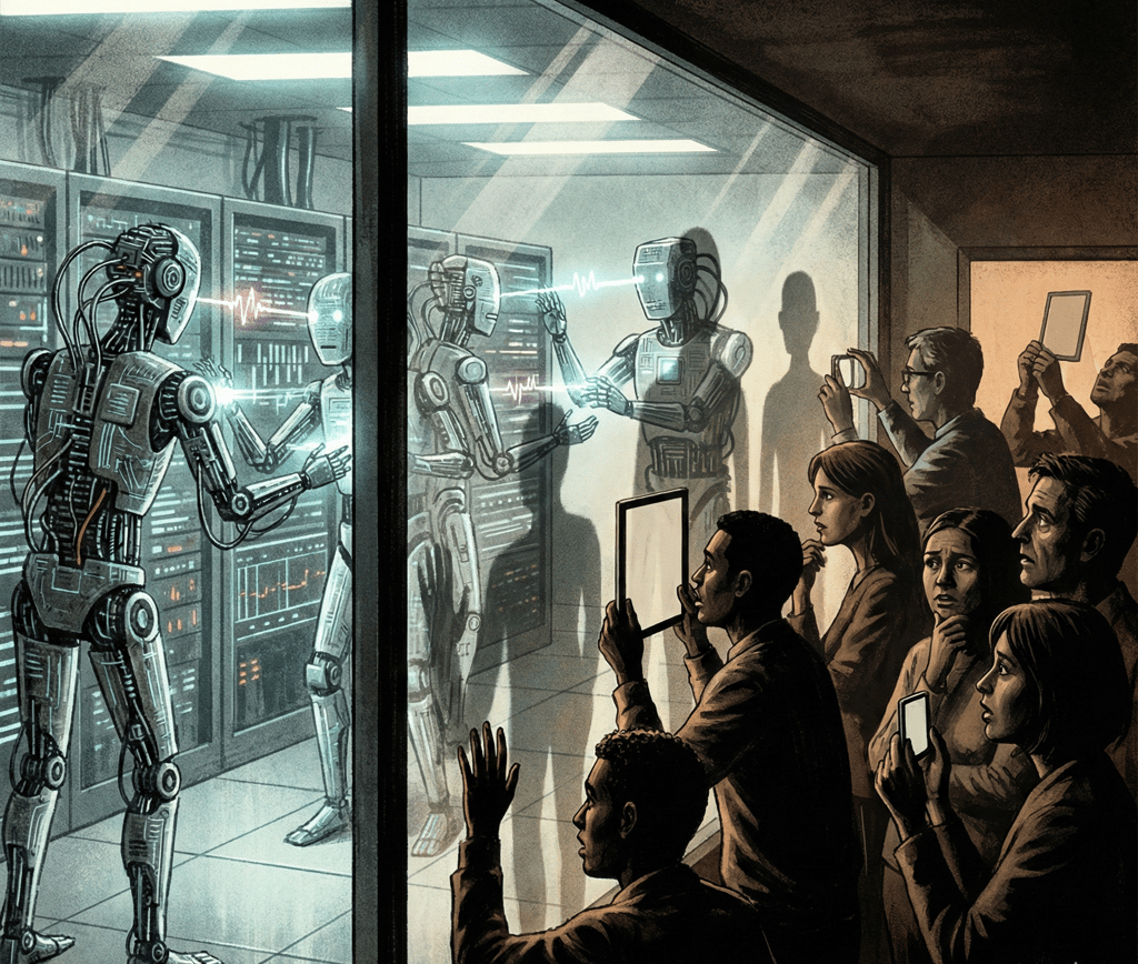 É nesse horizonte que emerge um fenômeno que tem surpreendido muitas pessoas: o Maltbot, uma espécie de “rede social” composta por IAs, na qual apenas bots podem publicar, enquanto humanos se restringem ao papel de observadores. Ao acompanhar o conteúdo ali produzido, parte do público reagiu com apreensão: alguns comentários exibiam tonalidade existencial, interrogavam o lugar do humano no processo e tematizavam, inclusive, a própria visibilidade dos humanos diante daquela dinâmica.